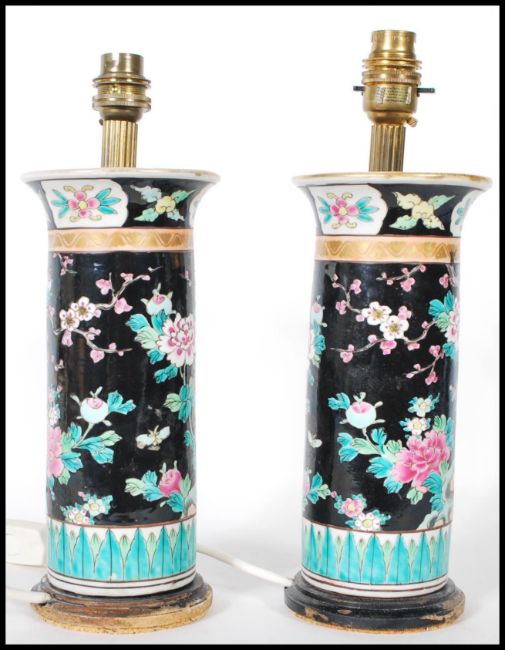 A pair of late 19th Century Chinese cylindrical ceramic vases decorated with all-over stylised floral and insect designs in shades of blue on a black ground, converted to table lamps raised on ebonised bases. Measures 32cm tall.