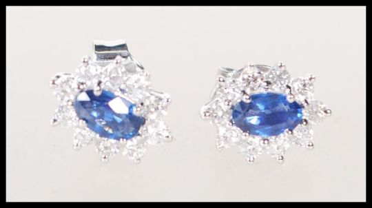 A pair of 18ct white gold earrings set with central oval faceted cut sapphire with a halo of diamonds of approx 1ct. Stamped 18k. Gross weight 1.5g. Measure 1cm.