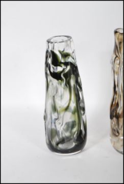 A selection of 20th Century retro glass vases of textured form all having trailed marble design to include two in smokey grey and two in brown colourways together with a matching small bowl.