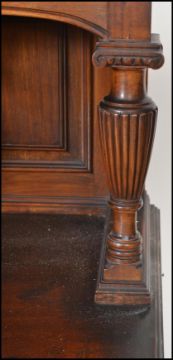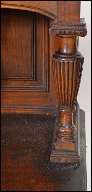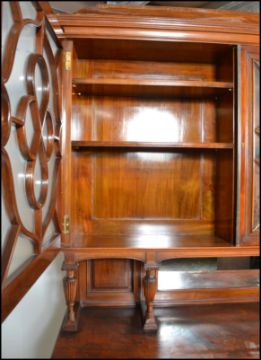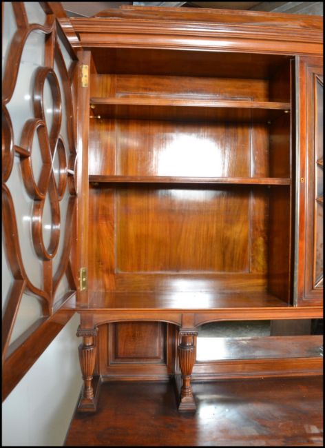 An exceptional late 19th Century solid mahogany buffet de corps / library bookcase cabinet. Raised on shaped scrolled feet supporting a dresser base with twin fielded panel doors housing shelving within. Above,a large twin glazed bookcase cabinet with stunning astragal glazed doors housing shelves set within. The cabinet raised on turned, reeded and fluted columns. The cabinet being of high quality being polished to the wood on the inside of the doors and body itself. Possibly, Liberty or Shoolbred of London. Measures 238cm tall by 152cm wide and 52cm deep.