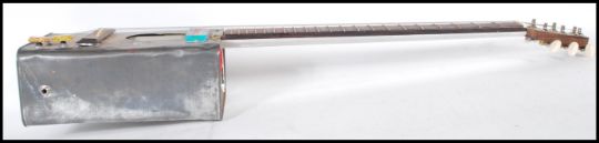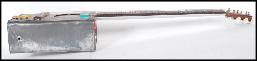 A 20th Century retro Afri-Can electric guitar, the body constructed from a vintage oil can having dials made from beer bottle caps, and a pick up made from scrap metal, having a marked fretboard culminating in a branded headstock.