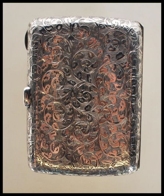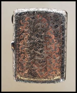 An early 20th Century silver hallmarked cigarette case of rectangular bowed form having engraved foliate and swirl decoration with a later added enamel panel depicting Queen Victoria. Push button clasp opens to reveal a gilt interior. Hallmarked for Birmingham date letter b 1901, makers marks for Deakin & Francis Ltd. Gross weight 71.9g. Measures 9cm tall y 6.5cm wide.