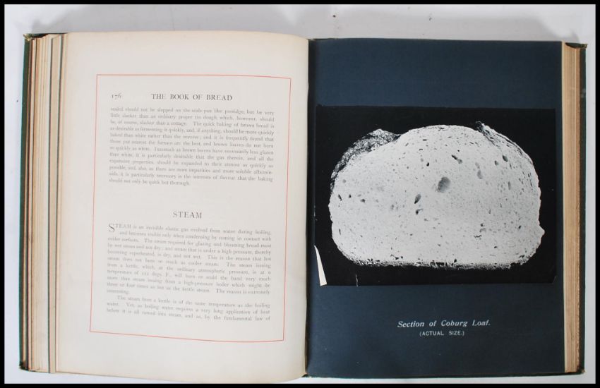 Owen Simmons ' The Book Bread ' (1903) published by Maclaren & Sons offices of the British Baker, London, includes ten photographic plates of cross sections of various loaves of bread (actual size) along with some coloured illustrations, green cloth with gilt lettering including advertising to the back.