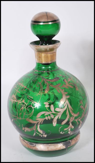 A believed 19th century Loetz manner silver overlay green glass Bohemian decanter and shot glass set together with a set of cranberry glass facet cut wine goblets