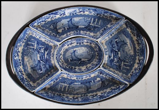 A 19th Century Booth's blue and white china hors d'oeuvres crudite set of oval form transfer printed with sailing boat scenes, made up of five interlocking dishes set within a fitted wooden tray. Retailer marks for Goode's, RD No. 733824.