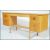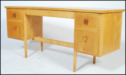 A vintage mis 20th Century beech kneehole writing desk of concave form, having a configuration of five drawers fitted with square form handles raised on tapering supports united by stretchers. Measures 73cm high x 160cm width x 60cm depth.
