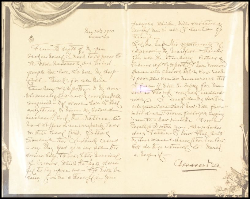 A 20th Century framed and glazed photomechanical print of a letter from Queen Alexandra concerning the death of King Edward VII having a decorative border decorated with angels and cherubs, with portraits of the Queen and late King to bottom right. Measures 50cm tall by 61cm wide.