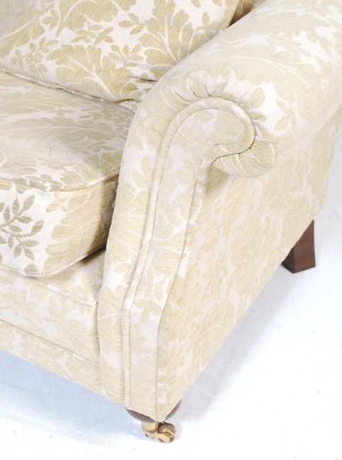A pair of matching contemporary three seat scroll arm button back sofa settees in the manner of Wesley Barrell. Upholstered in a rich chintz material raised on bun feet terminating on brass castors.
