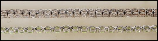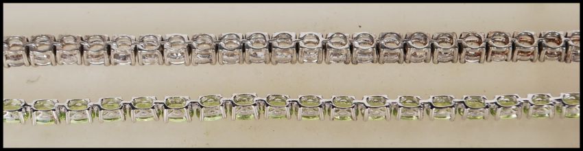A pair of stamped 925 silver bracelets. One set with faceted cut round white stones and the other set with oval cut green stones. Both marked 925. Longest measures 7 inches long. Gross weight 26.6g