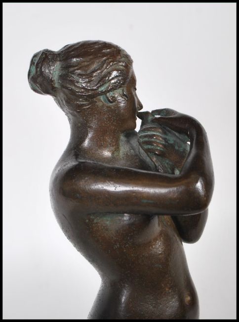After Charles Auguste Fraikin, Belgian (1817-1893) - A early 20th Century bronze sculpture of Venus a la colombe raised on a circular base with the nude figure shown holding and caressing a dove. Measures 31cm tall by 11cm diameter.
