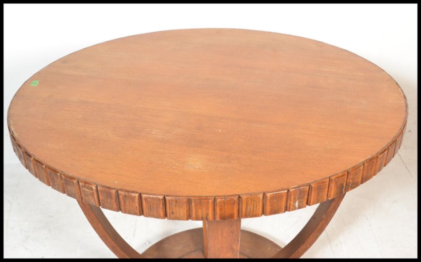 A early 20th Century Art Deco oak top hall table of circular form having applied walnut panels to side. Raised on a circular stepped plinth base with openwork bentwood supports. Measures 74cm tall by 107 cm diameter.