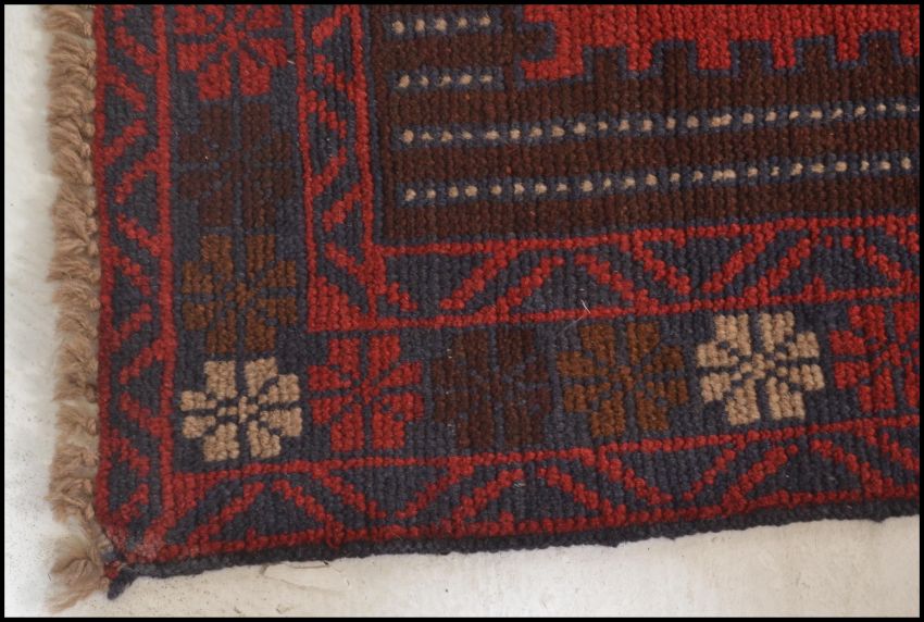 A hand knotted woolen Herati Baluchi carpet floor rug, central panel with traditional motif and double full running border. Measures 193 cm x 104 cm