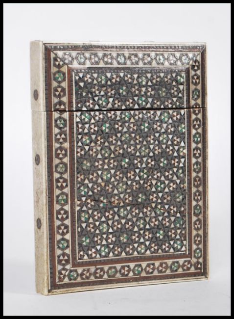 A late 19th Century Anglo Indian Sadeli celluloid card case having Vizagapatam micro mosaic inlay on sandalwood. Measures 10cm tall by 8cm wide.