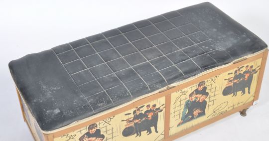 Avalon Yatton - The Beatles - A rare 1960's Beatles ottoman / blanket box. Vinyl padded hinged cover above panelled sides transfer decorated with images of the band and their facsimile signatures. Raised on tapering brass feet the hinged lid opening to reveal a spacious interior. Measures 40cm x 102cm x 46cm.