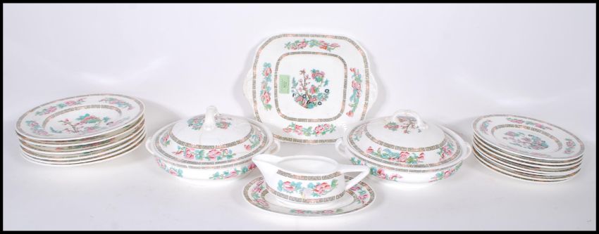 A 20th Century Minton dinner service in the Indian tree pattern having pink floral sprays and greek key patterning to the edge consisting of a square centerpiece plate, two tureens, gravy boat and plates.