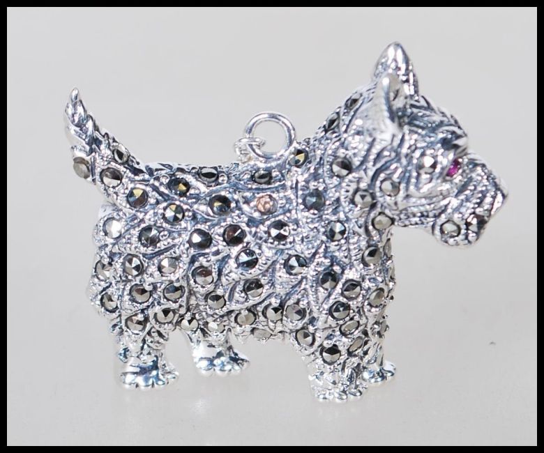 A sterling silver and marcasite pendant in the form of Scottish Terrier 'Scottie' dog having red stone eyes. Stamped sterling to verso. Gross weight 10.5g. Measures 3.5cm wide.