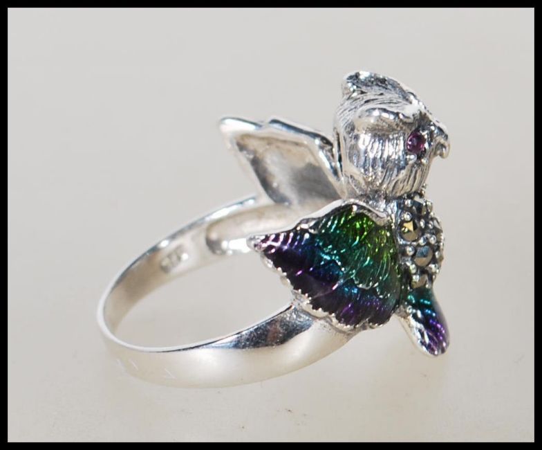A stamped 925 silver ladies dress ring in the form of a owl having enamel plique a jour wings and tail with illusion set body and purple stone eyes. Ring size P. Weighs 6.2g.