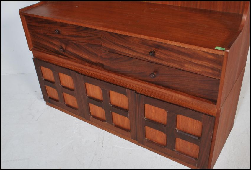 A retro 20th Century Teak wood highboard bookcase cabinet dresser by Nathan with a series of open shelves to the top over a configuration of drawers and cupboards, separates into two. Dimensions are 199cms x 125cms x 46cms.