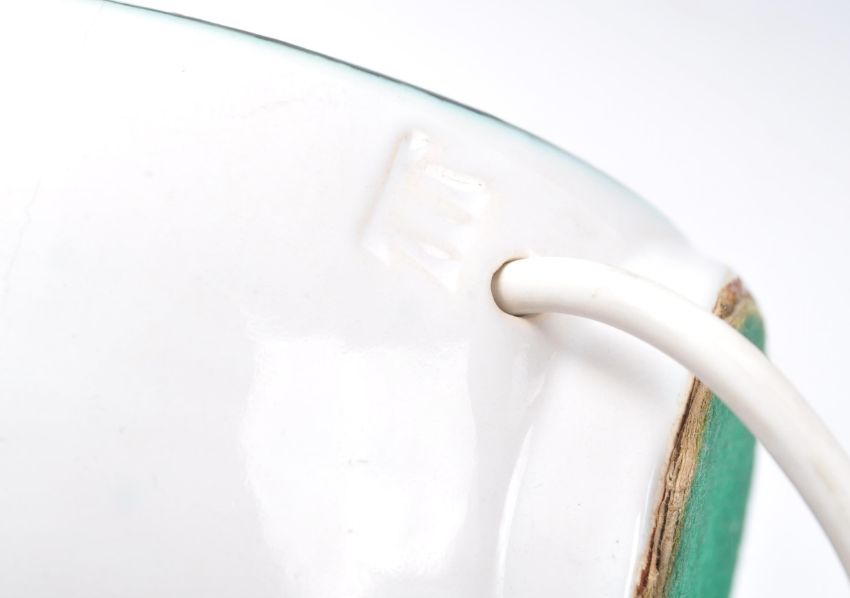 Paul Ellery - Tremean Pottery - A 1960's Cornish retro vintage studio art pottery lamp of round ring form with tapering and bulbous neck having a white glaze and pale blue and brown pattern to front and back. Stamp marks to side. Measures; 30cm.