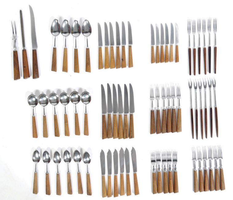 Mills Moore - An extensive set of original 1960's English retro vintage Sheffield stainless steel cutlery / flatware having shaped walnut handles. Comprising: 6x fish knives, three sets of 6x knives of graduating sizes, 5x forks, 12x larger forks, two sets of 6x skewer forks, 4x serving spoons, 6x table spoons, 6x soup spoons, and a three piece carving set (72 pieces in total)