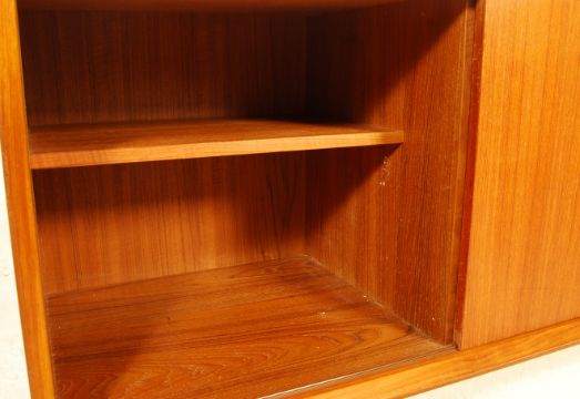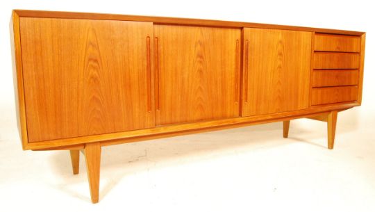 An exceptional 1960's Danish retro vintage teak wood sideboard credenza comprising a bank of four drawers to the right with three sliding doors revealing spacious shelved interiors. Remains of makers stamp to verso. Measures 75cm x 200cm x 46cm
