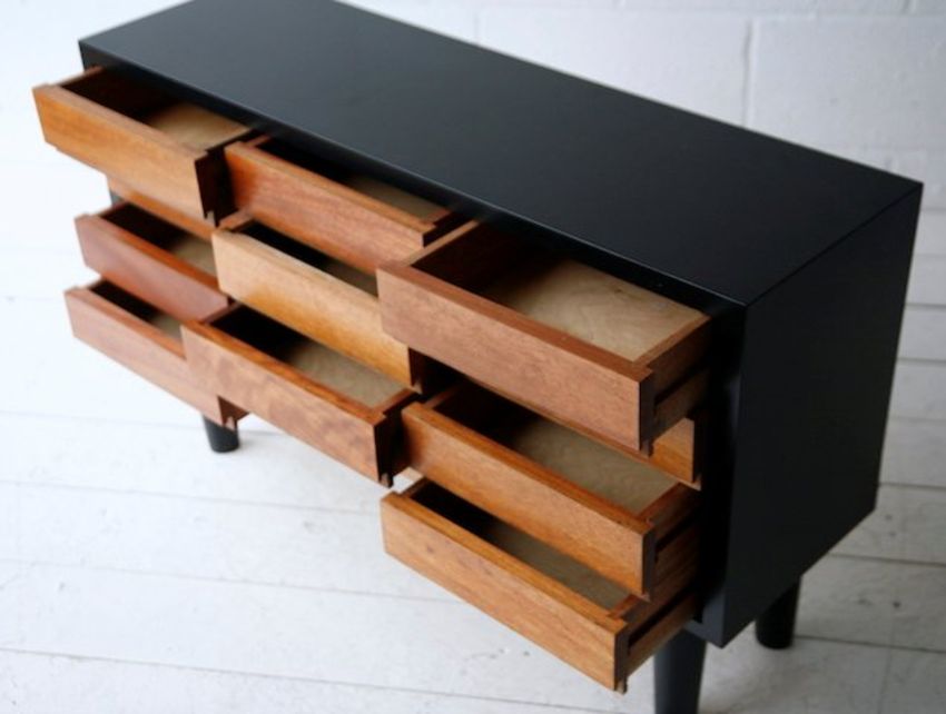 An original mid to late 20th century retro vintage teak chest of drawers. The bank of twelve solid teak drawers having an ebonised wooden frame raised on tapering wooden legs. Measures: 59cm x 94cm x 28cm.