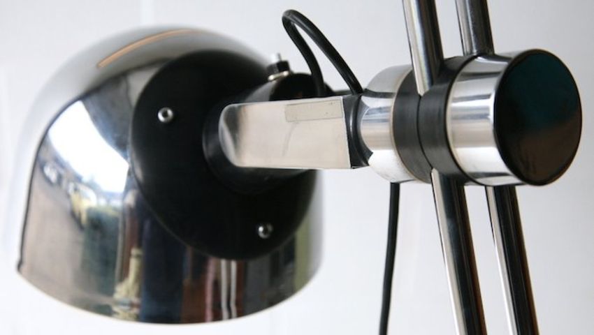 J Perez & P Aragay - A rare and unusual 1970's retro vintage chromed floor standing / standard lamp consisting of a domed chrome shade with unusual attachment and multi adjustable slide on a single one piece double bar frame with a weighted cantilever base. Measures; 153cm.Pictures may show lights on and have all light bulbs present however some light bulbs may not be included and all lights are sold as untested.