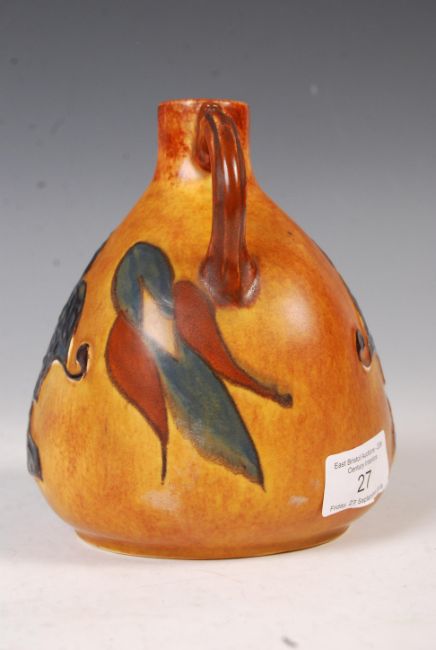 Clews & Co Ltd - Chameleon Ware - A 20th century retro vintage studio art pottery jug having a mottled brown colourway with Persian  design motifs. The large body having a small neck and spout with thin handle. Markings to base. Measures; 16cm.