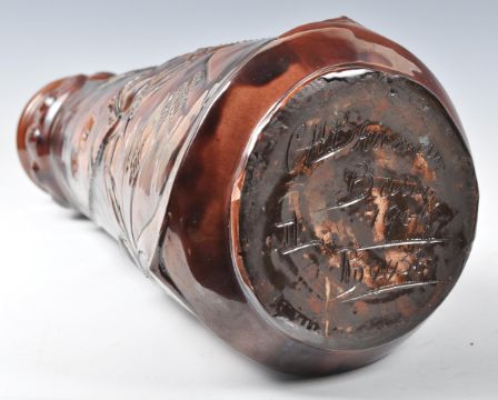 CH. Brannum - Barum Ware - RD 44561 - An early 20th century c1909 antique vintage bespoke Devon studio art pottery floor vase having a repeated scene of a grotesque toads. the vase having a wide base with tapering form with a bulbous neck and flared rim, finished in a glazed brown colorway. Artist markings to the base. Measures; 41cm.