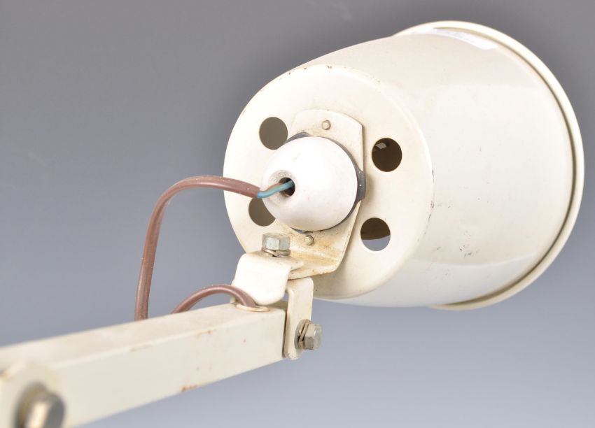 Memlite - A mid 20th century vintage industrial workman's / factory articulated desk / table lamp fitted to a switch box supporting three articulated box section arms with a conical bucket shade atop all finished in a white. Impressed mark to elbow joint.