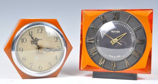Goblin - Molnija - Two original 1960's retro vintage mantel clocks comprising a Made In USSR Molnija example of orange Lucite construction raised on a black Bakelite base with black Bakelite dial and Roman numeral chapter ring. The other a British made Goblin example of hexagonal orange bakelite construction. Largest measures: 12cm.