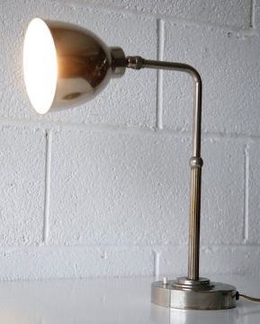 An original 1930's art deco vintage designer chromed table lamp / wall light comprising of a three stepped round base with push button, reeded column, bent tubular neck support and a stepped conical bucket shade on a ball joint. Measures; 36cm. Pictures may show lights on and have all light bulbs present however some light bulbs may not be included and all lights are sold as untested.