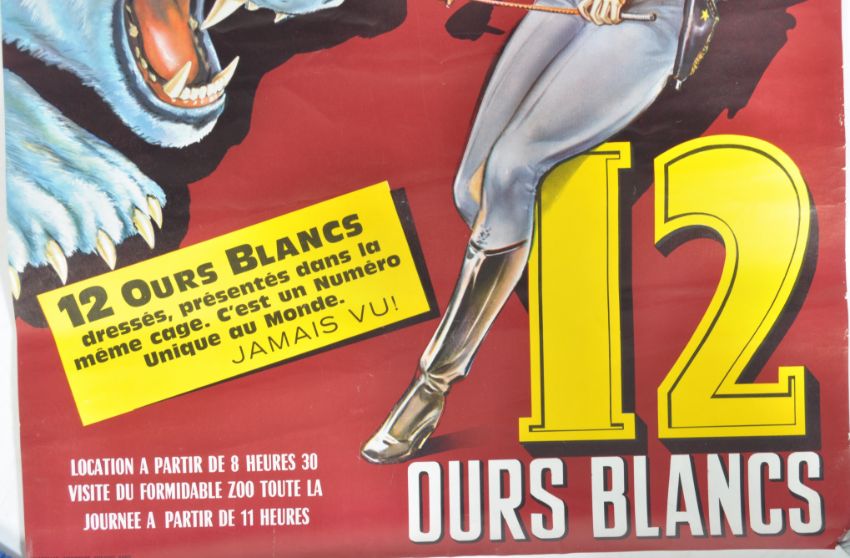 Pinder Et La R.T.F. - La Nouvelle Piste Aux Etouiles 64 Une Realisation De Gilles Margaritis - An original rare vintage 1960's circus point of sale ticket advertising poster featuring 12 polar bears. The poster showing a polar bears head and female trainer on red ground. Measures; 64cm x 43cm.