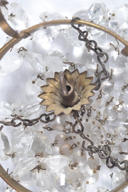 A 19th century cut glass empire type basket chandelier of small proportions having strings of multiple faceted glass droplets suspended on a brass ring with leaf and flower decoration. Measures; 21cm diameter.
