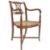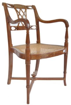 A late 19th century satinwood carver library  desk armchair - chair. Raised on turned, tapering legs united by cross stretcher with finial centre having a bergere caned seat. Scrolled elbow supports rise through to a lattice worked back rest with shaped and pierced top rail. Measures 88cms high x 53cms wide x 47cms depth  x 43cms height to seat