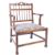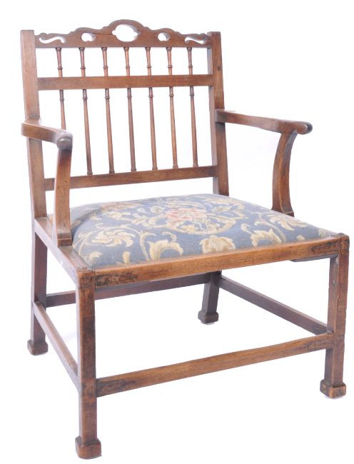 An 18th century mahogany country house library / drawing room armchair. Raised on squared legs with block pad feet united by stretchers. Above, a padded overstuffed seat flanked by shaped s-scroll elbow rests and a spindle gallery backrest with pierced top rail. Measures 87cm x 63cm x 50cm.