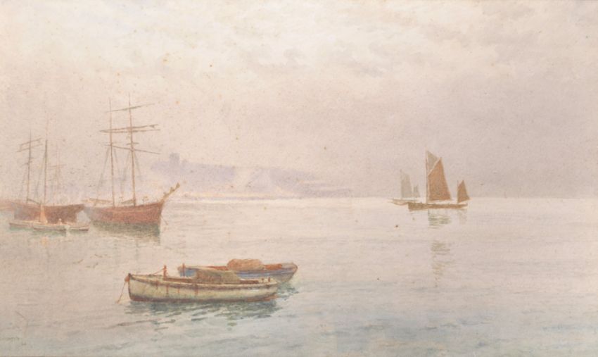 George Brooks Percy Lillingston (1871-1899) Watercolour on paper painting of boats at a mooring signed by artist. Framed. Consigned by a descendant of the artist, Lillingston was a painter of landscape and figure subjects. He lived in London and Leamington, latterly moving to Penzance from where he painted his two Royal Academy exhibits in 1878 and 1899. He was around Newlyn at the founding of The School of Art in 1899 by Stanhope Forbes and in consequence seeming much influenced by it. Measures: 31cm high x 51cm wide. Frame measures 53cm x 64cm.