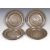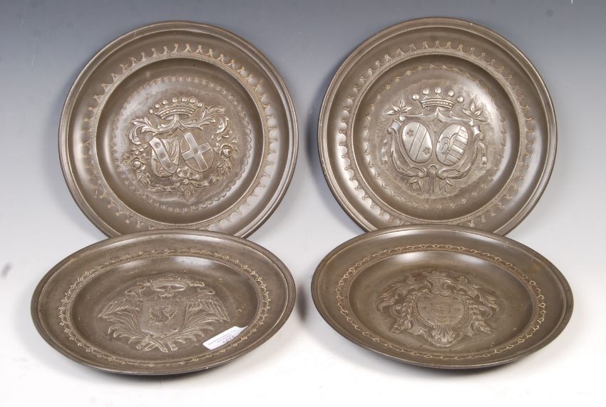A set of four 18th / 19th Century pewter charger plates having large repousse armorial crests within engraved ribbon borders. Two having CIL touch marks to verso and the other pair having FW touch marks. Measures 23cm wide.