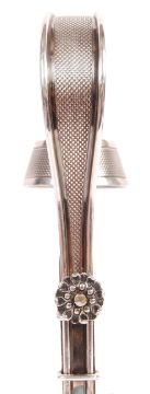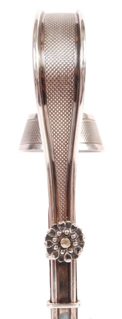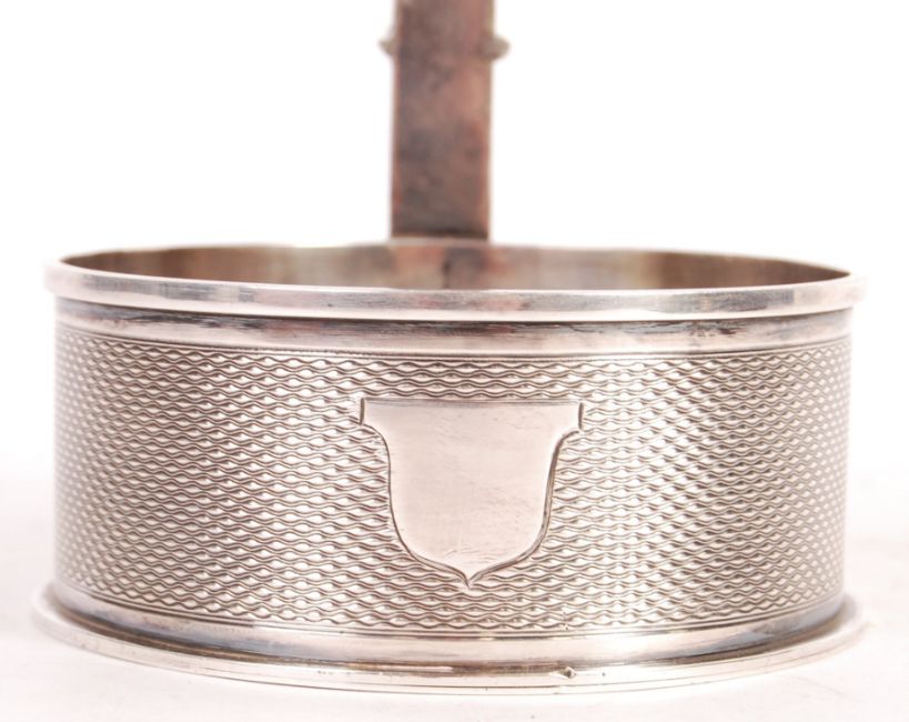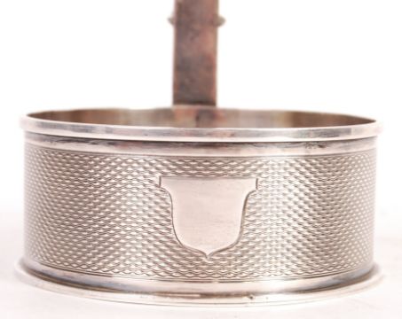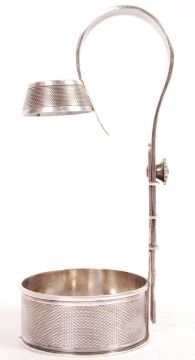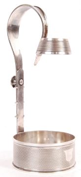 A 19th century Victorian antique silver plated Elkington & Co adjustable champagne / wine bottle holder with engine turned decoration. The circular formed base having an upright support and flower screw adjuster fixing the position of the sweeping handle and bottle neck holder. Silver plate marks and number 7067 to base dating 1891. Measures; 25.5cm - 36cm.