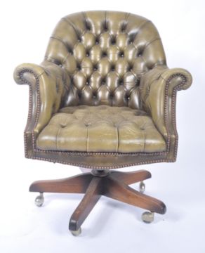 A 20th century green Leather Chesterfield / Captains deep button back  green leather upholstered swivel office / desk chair having a five point mahogany swivel base with castors. Measures 102cms high x 78cms wide