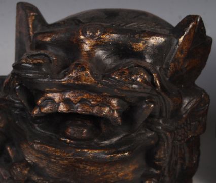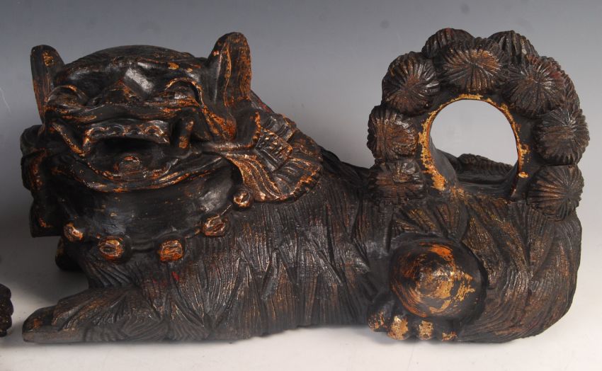 A pair of antique Chinese temple lions / dogs of Fo hand carved from paulownia wood. Both carved with bead necklace collar and mouths open, the tails forming a handle. Remains of gilt decoration. Measures 42cm long.