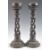 A pair of 19th Century Victorian carved oak treen candlesticks raised on stepped circular bases with barley twist helix columns supporting bowl sconces with bronze pricker rims. Measures: 25cm high.