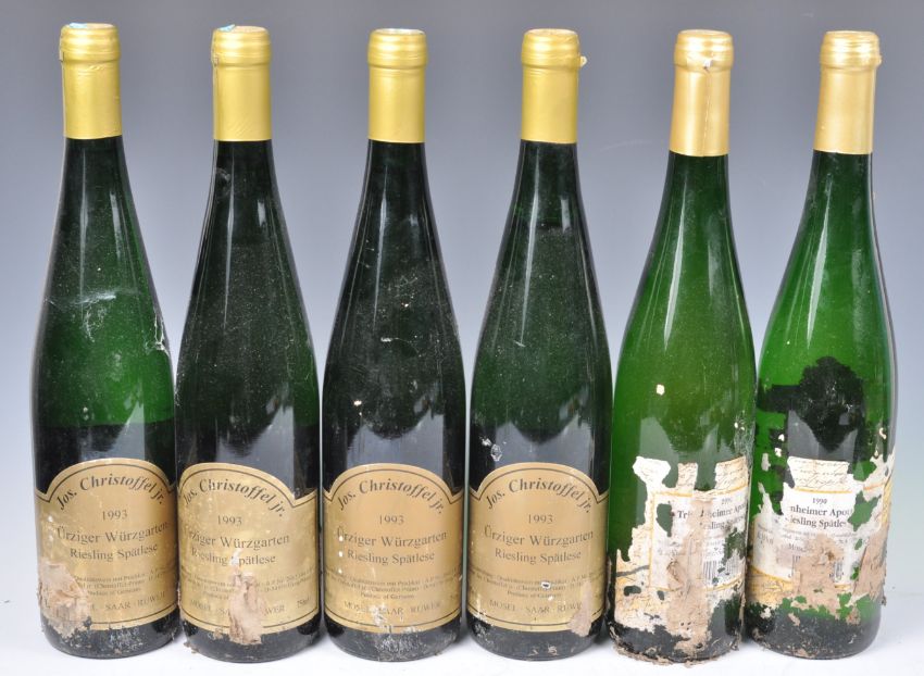A large collection of 25x bottles of German wine comprising: 2x bottles 1995 Mosel Saar Ruwer Zeltinger Himmelreich Riesling Kabinett, 4x 1983 Weingut Peter Prum Erben Wehlener Sonnenuhr Riesling Kabinett Mosel Saar Ruwer, 3x 1990 Weingut Burg-Layer Schlossberg Riesling Spätlese, 4x 1993 Jos. Christoffel Jr Urziger Wurzgarten Riesling Splatese, 1996 JL Wolf Riesling Pfalz, 1983 Kurprinz Mainzer Domherr Auslese, 1973 Klostergarten, 1989 Mosel Saar Ruwer Oberemmeler Karlsberg Riesling Auslese and others. Great collection.
