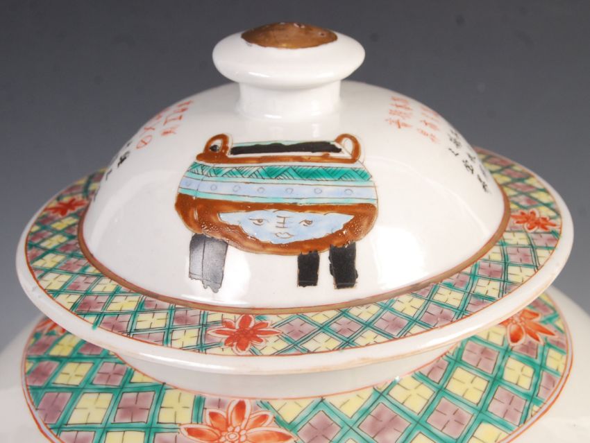 A large and impressive late 19th Century temple jar and cover having a white enamel ground and decorated with scenes of a large jardiniere planter with tree having script and calligraphy to verso. The jar of bulbous ford with matching decoration to lid. Unsigned to base. No visible damage. Measures: 44cm.