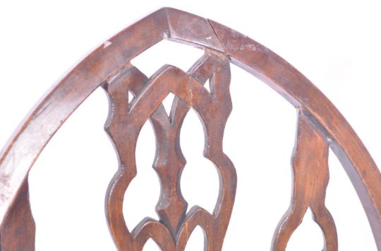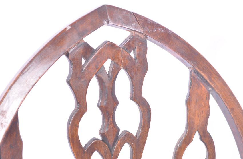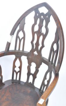 A rare pair of believed 18th / early 19th century elm wood Windsor chairs  ( armchairs ) Each chair with cabriole legs united by inverted bow stretchers supporting saddle style carved seats. Above, rare unusual gothic window arch back rests with pierced and lattice work panels flanked by scrolled elbow rests. The chairs having been stored in an attic for a very long time by the vendor, one leg partially missing to one with some old repairs elsewhere on both chairs. Measures 104cm high x 67cm wide x 46cm depth