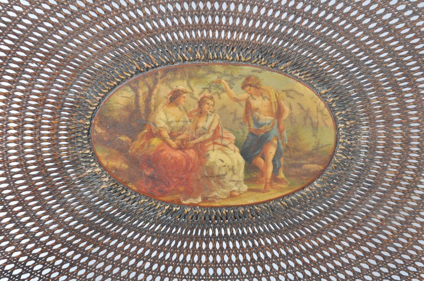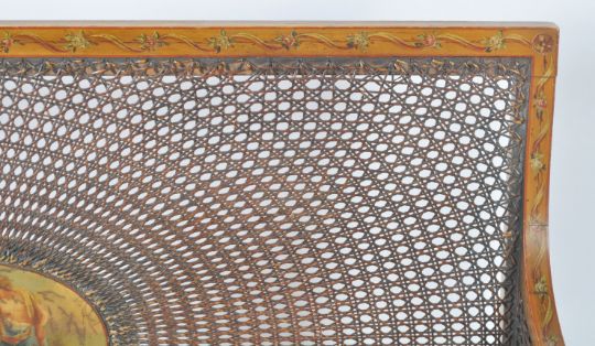 A late Victorian  / Edwardian satinwood hand painted bergere drawing room caned two seat sofa. Raised on squared legs with spade feet supporting a hand painted show wood satinwood frame with inset caned work seat, back and sides. The centre with stunning handpainted cartouche oval lozenge having classical scene. Measures 98cm high x 116cm wide x 60cm depth