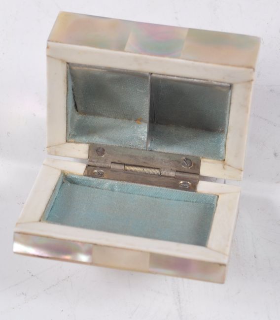 A 19th Century High Victorian mother of pearl panelled double postage postal stamp box having and ivory lined interior with twin silver plated stamp compartments. Spring hinged lid with decorated shell panels. Original tooled and lacquered card paper base with small brass feet. Stunning example with the panels in near immaculate condition. Measures: 6.5cm.