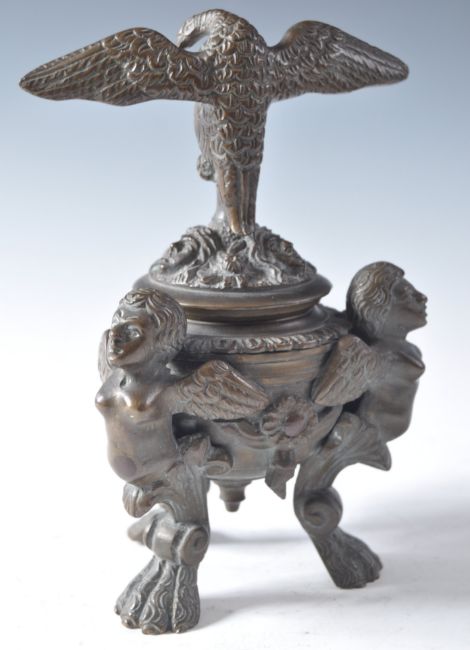 A Napoleonic Italian Grand Tour bronze cast lidded inkwell having a triple faced body with winged female figurehead with ribbon and rosette decoration each figurehead having a tidal wave and claw foot leg raising the inkwell. The lid having three faces with an eagle atop. Measures; 16cm tall.