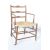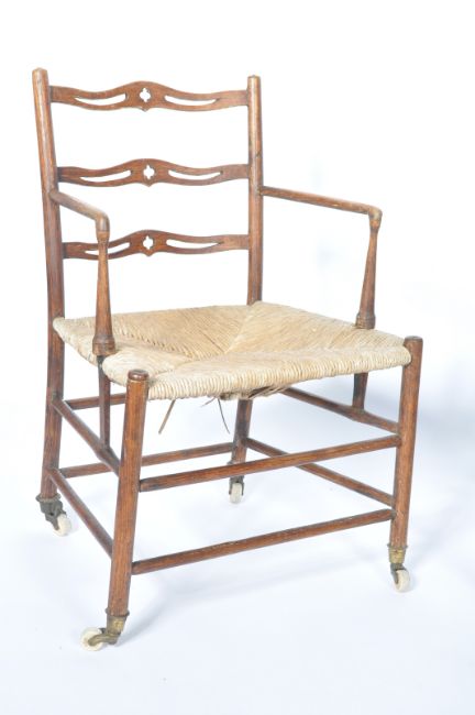 A matched pair of circa 1900's believed Edward Gardiner for Ernest Gimson oak and rattan weave pass through chairs / armchairs. One with moustache pierced ladderback rests over rattan seat flanked by pass through elbow rests. Raised on turned legs united by peripheral stretchers. The other with shaped toprail over pierced ladderback rest with pass through elbow rest supports on turned legs united by stretchers. Measures 82cm x 57cm x 48cm & 85cm x 62cm x 44cm