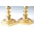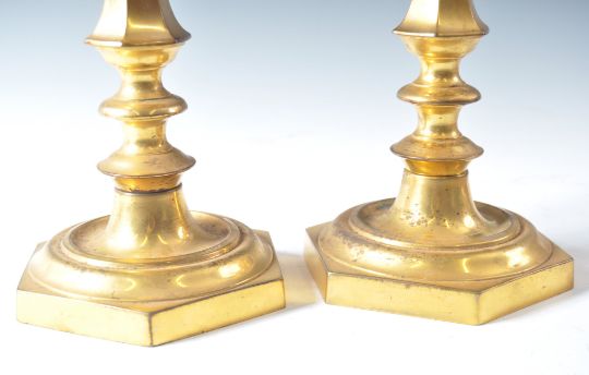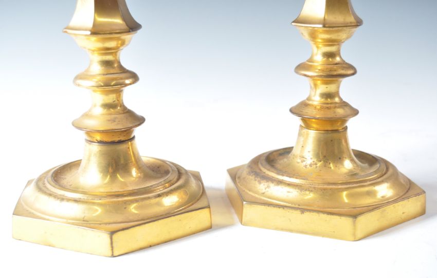 A pair of early 19th Century gilt bronze French ormolu candlesticks raised on hexagonal bases with double knopped stems with fluted hexagonal stem with further double knop under the sconces. Measures: 28cm: